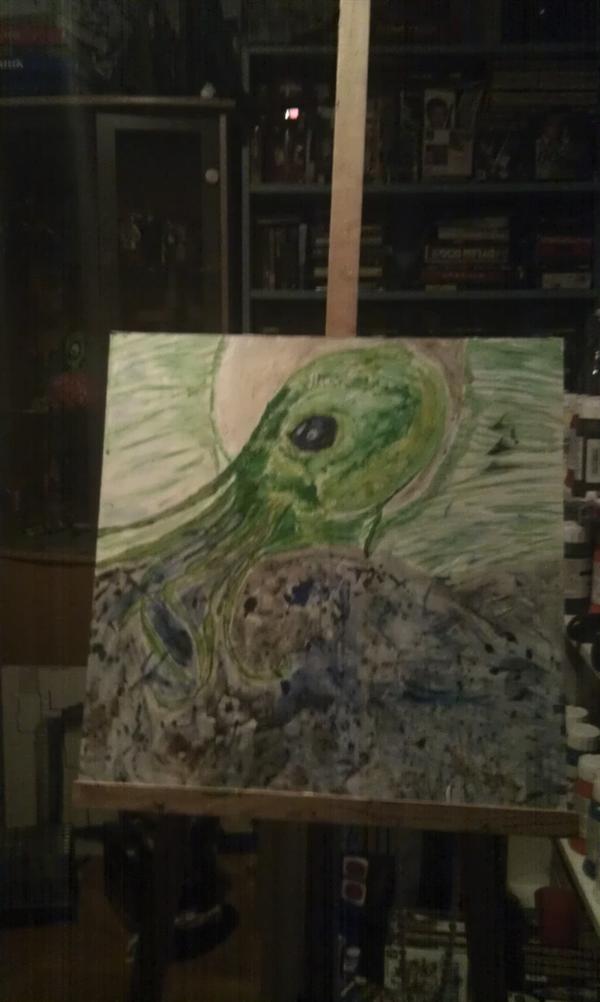 I really, really love H.P Lovecraft world, even so much that I got a creature from his world inked in my body! Than you really like something and I have read a lots of his stories in English I prefer than Swedish. I got inspiration from his world and had to paint something, that I have done my version of this creature, sure you know who it is? (Jag verkligen älskar Lovecraft värld även som mycket att jag har en varelse från hans värld tattuerad. Då gillar man verkligen något och har läst hans berättelser på engelska, föredra det än Svenska. Jag fick inspiration från hans värld och målade något, jag målade min version av varelse, såklart du vet vem det är?) I give you…